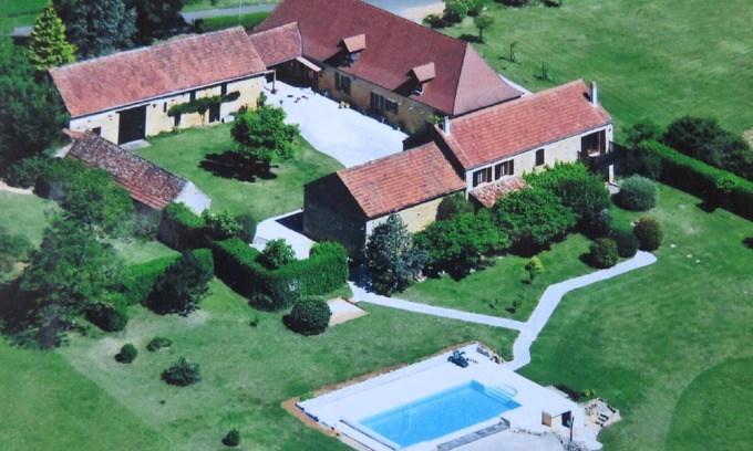 At Domaine de Manilau, you are in the center of Périgord: Sarlat, Bergerac, Monpazier, Lascaux, and all the castles. Quiet, on two acres with an unobstructed view, this pretty farmhouse of 1840 in blond Perigord stone articulates around a square courtyard. The farmhouse, a barn, a tobacco barn and the barn combine independence and friendliness. The barn has been renovated with care in respect of tradition. Infinity pool with salt and private and covered parking.