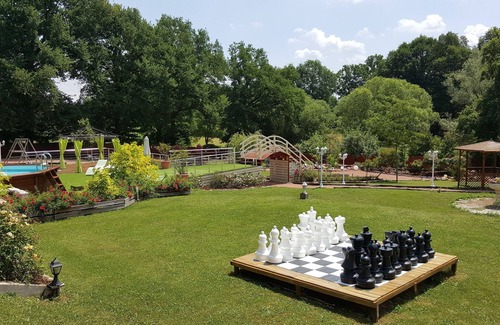 The old shady park includes many old trees including a set of chestnut surrounding petanque, especially if a beautiful three centuries. You will also find many shrubs (lilac, wisteria) and many fleurs(roses,iris,tulipes,glaieuls,dahlias,oeillets,bougainvillées,célosis,géraniums,sundavilles,impatiences,etc...) and a fountain, a small decorative wells, stone benches, a children's cabin. All walkways are lined with white stone gardens.