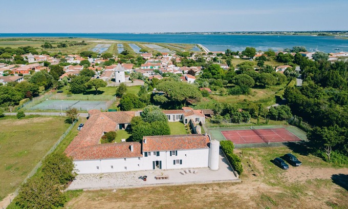 Nestled in the charming village of Loix on the island of Ré, the Domaine des Tours offers a serene escape amidst natural beauty and historical charm. This 16th-century wine estate, lovingly restored over the past two years, combines modern comfort with beautiful old stones. Upon entering the estate, you will be welcomed by an enchanting inner courtyard, shaded by century-old lime trees, inviting you to relax and immerse yourself in the atmosphere.Upon entering, the main house reveals its spacious and beautifully furnished interiors, having been carefully restored to preserve the original features. The open kitchen is a cook's dream, with a breakfast bar, dining table, and all the modern appliances you might need. The living room includes a fireplace area, two large sofas, and an audio system, perfect for relaxed evenings.The main house offers five bedrooms, each designed for comfort and style. Four of them are spacious double rooms with private bathrooms: three with king-size beds and one with a queen-size bed. The fifth bedroom has a folding double bed, ideal for additional guests.A few steps from the main house, the annex offers additional accommodation with two bedrooms, one with a king-size bed and the other with two single beds. The annex also has its own open kitchen, a spacious living room with a fireplace and a dining area.The property extends over more than 1.7 hectares, with a private car park, a tennis court, a sauna, 10 adult bicycles (adults only) and access to an orchard supplied with fig trees, pear trees and plum trees.The Domaine des Tours is located near salt marshes and meadows, with no immediate neighbours and the port of Loix just 300 metres away. There is a very convenient cycle path located right in front of the house. Guests can enjoy walking directly from the house into the countryside and explore the neighbouring beaches.Please note:Household linen is optional at €25/person and includes: Bed linen / bath towels / kitchen linen / beach foutas