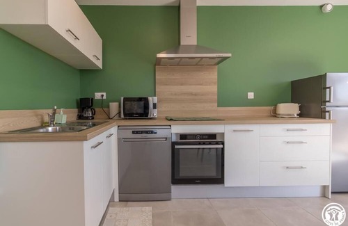 On the Sarlaboux family's farm (cereals), this beautiful brick and pebble shed also accommodates 4 other gîtes. This apartment benefits from a swimming pool, a SPA and a pétanque court in the shade of the trees, shared with the other gîtes. Unenclosed outdoor space, private terrace at the gîte with garden furniture and barbecue. A stone's throw from the Toulouse metropolis, you will be close to numerous points of tourist interest and business centers: 8km from the Toulouse Exhibition Center (MEET), 12km from Toulouse-Blagnac airport and the Aéroscopia museum, 8km from the Bouconne forest and the Seilh golf course, 6km from the Château de Merville, 3km from Aussonne, 11km from Granada and its listed market hall (one of the most beautiful markets in France!), 21km from the leisure park and adventures of Animaparc, 23km from the leisure center of Lake Isle-Jourdain, 25km from Château de Laréole and only 1 hour by car from Montauban and Auch. Nature Gîte, on one level (70m²), in a beautiful harmony of greens, with large living room (integrated kitchen, dining area and lounge area with flat screen TV and convertible sofa for 2 people), 2 bedrooms (1 bed for 2 people 160*200cm) (2 single beds 90*190cm), bathroom (walk-in shower and sink), laundry room (washing machine) and separate WC. Electric heating, reversible air conditioning in the living room. Wifi Internet access. Large common room which can be used for small seminars of 50 people or family reunions. Parking at the entrance to the property.