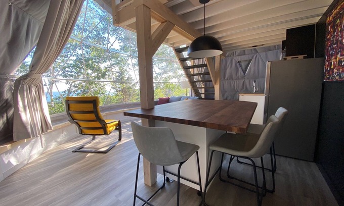This dome is equipped with a full kitchen and bathroom, bedding and towels, a queen-size bed on the mezzanine, a sofa bed and a terrace with a gas BBQ (except in winter). We offer your first dose of locally roasted coffee, oil, sugar, salt, pepper and products from Percé's Poussière d'Étoile soap factory.