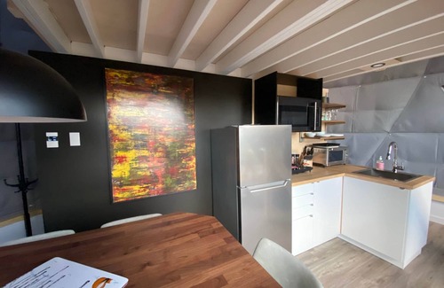 This dome is equipped with a full kitchen and bathroom, bedding and towels, a queen-size bed on the mezzanine, a sofa bed and a terrace with a gas BBQ (except in winter). We offer your first dose of locally roasted coffee, oil, sugar, salt, pepper and products from Percé's Poussière d'Étoile soap factory.