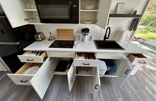 Our domes features your own private hot tub, grill, and en-suite bathroom and sleeps up to four. The geodesic dome includes a queen-sized bed, fold-out couch, fully stocked kitchen. Included is a Keurig, coffee and kitchen essentials.