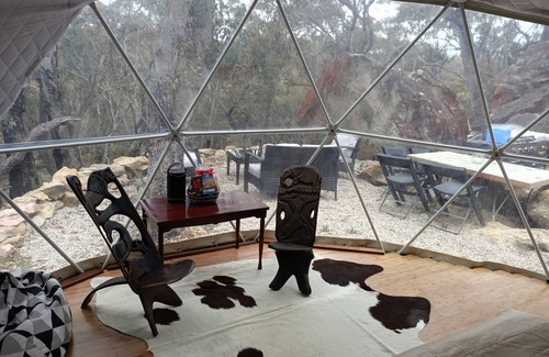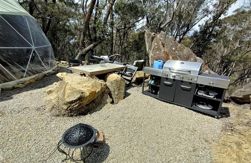 The Dome is set between a rocky outcrop in the native forest with amazing views of the forest. Hear the birds sing and the frogs croak. It is private and secure with an outdoor BBQ kitchen with all cooking utensils and cleaning products.