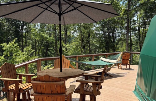 The Ambassador dome boasts amenities including a luxurious bathroom with shower, vegan bath products, cotton spa towels, queen bed with exquisite ironed linens, fully stocked galley kitchen with refrigerator, induction cooktop, espresso maker, and more. The dome features a dining area, gas indoor fireplace with club chair seating, and an additional reading nook. Outside use the wood-burning firepit, propane grill, table, or just relax on one of the deck lounge chairs.