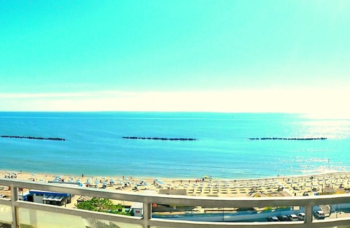 Large three-room apartment on the eighth floor in a condominium facing the sea, 50 meters from the pedestrian area and the promenade on the main avenue of Lido di Pomposa. It consists of: entrance, living room with kitchenette and double sofa bed, spacious double bedroom, bedroom with two single beds, bathroom with washing machine, air conditioning, large balcony with fantastic sea view where you can relax enjoying all the nuances of the beach and of the sea, parking place. 4 + 2 beds