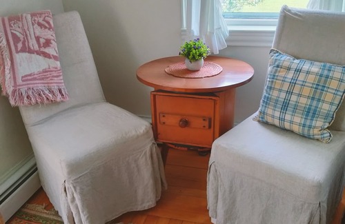 5 Bedroom, 3 Bath (sleeps 8), family room, parlor, living room, on 1.5 acres; bath includes claw foot tub; one 1/2 bath, 2 full baths ; antique furniture and lovely bay windows to play cards or curl up and read a book. Family room for coffee around the walnut table for morning breakfast and chat; quiet parlor w rocking chair to draw or paint. Walk down Downeast Magazine'
