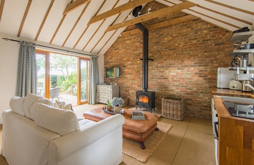 Open plan living space with sofa, wood burner, kitchen area and dining area