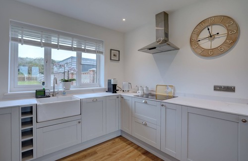 Lounge/Diner: Lovely dining table to seat everyone with double French doors looking out over the front garden. Two comfortable sofas are the perfect place to chill out after a days exploring and watch the large flat screen Smart TV. There is a coat and boot rack, side board, coffee table and display cabinet filled with books and games.