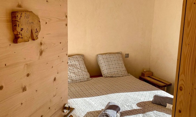 Notre Petit Cocon 2 offre 1 lit Queen Size en 160x200 pour une halte simple et revigorante, avec vue sur la montagne. Un petit balcon avec une table de jardin et 2 chaises permet d'en profiter plus pleinement.