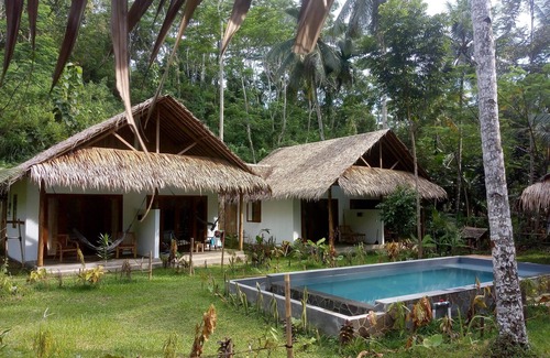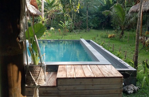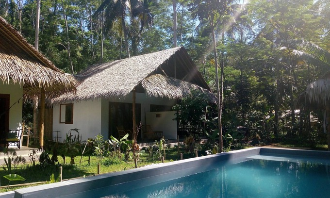 Spacious family bungalow on a 4000m2 plot nestled in the jungle, with a beautiful swimming pool (shared with the 3 other bungalows) just 500 m from the ocean and Batukaras surf spots. Built in the traditional way, our bungalows have Western comfort, high-end bedding and ultra-fast WiFi. You will enjoy a bathroom with a view of the jungle, a large terrace and a small private garden. We can organize all transfers from and to airports and stations by private shuttle (with roof bars for the boards), manage your scooter and surf rentals. Our local guides are at your disposal for all excursions, surfguiding, etc. Come and enjoy the Indonesian waves, the green canyon and all the many family activities of BatuKaras with your family.