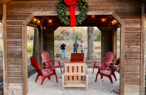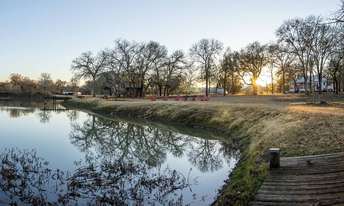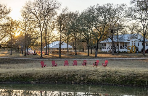 The farmhouse was fully renovated in 2018 and sits on a private, picturesque property in Cedar Creek, Texas. The Master bedroom includes a king-size bed and a private bathroom. The second bedroom has a queen size bed, a twin bed and an additional trundle. The property includes 2 large ponds, fully stocked and ready to fish. Enjoy coffee or a cocktail on the front porch or in the pond house while your party takes in all that the ranch has to offer.