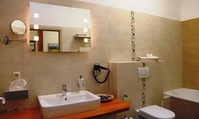 Our deluxe rooms are located on the first floor of the hall building. Double room with double bed, bath or shower / WC, hairdryer, cosmetic mirror, bathrobe, flat screen TV, telephone, internet LAN, desk, refrigerator, sofa set for one more person, barrier-free, non-smoker The photos show sample facilities. The individual rooms are individually different.