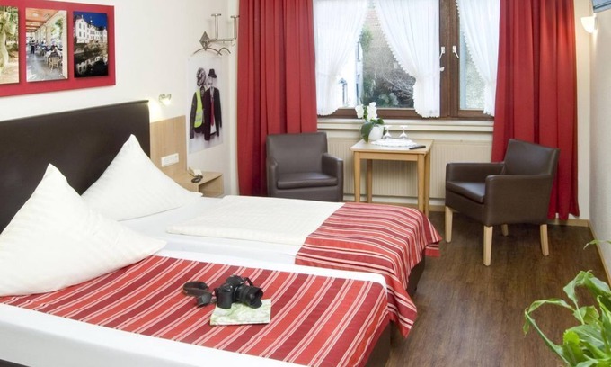 Comfortably furnished double room with shower / WC, TV, desk, telephone and sitting area.