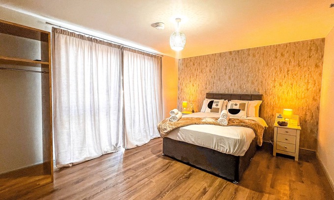 A spacious, modern bedroom on the ground floor with king bed, fitted with a large Smart TV and comfy bed. This property utilises a communal bathroom complete with toilet, sink and walk in shower.