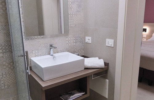 -Our deluxe double room (with an extra single foldable bed that can be added>for 3 guests) features a private bathroom with a shower, hand basin, a bidet, WC and a hairdryer, with free toiletries on top, completely accessible for guests using a wheelchair. The room features A/C, a flat-screen TV with satellite channels, a comfortable wardrobe, a mini frigobar, a handy safe box and an inner courtyard view. Our splendid room has been entirely renovated recently. The building offers a private entrance and a dining area, where you will enjoy a rich Italian and continental buffet breakfast.