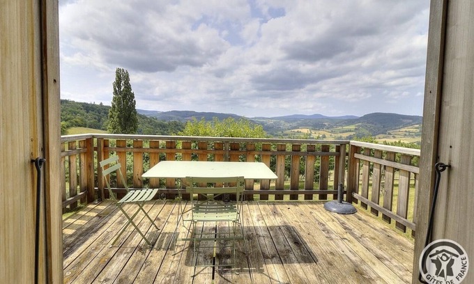 Block of 4 chalets in a peaceful, leafy spot with lovely views of the hilly countryside. Unspoilt setting far from the city bustle, ideal for having a restful holiday. Nearby : hiking & mountain biking trails (the village is crossed by the track 'Compostelle-Cluny-Le puy en Velay'), leisure area (play area for children, boules area, table tennis), inn (takeaway food). Detached wooden chalet set in a meadow including 4 identical buildings. Accessed via terrace (wooden stairs) or practically single level access (1 step) via kitchen on the other side. Ground floor : living room (double sofa bed), kitchen, WC. 1st floor : 2 bedrooms (double bed, balcony), (2 single bunks), bathroom. TV point. Bed linen not supplied (no renting possibility too). Large meadow. Parking. Barbecue is not allowed on-site (a fixed one is available in the leisure area). Close to the village hall & a public campsite (6 pitches). Ideal for groups, seminars, courses. Disc golf : 5km. Adventure Park (outdoor activities sports) : 10 km. Zoo : 20 km.