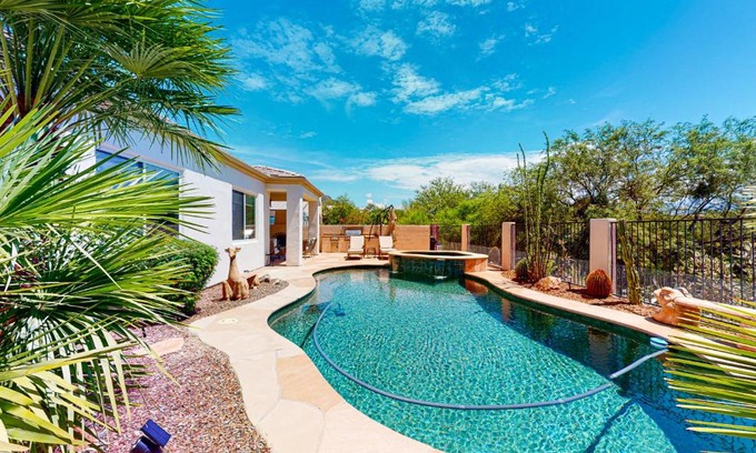 - Southwestern stunner with enclosed yard, pool, putting green, & grill