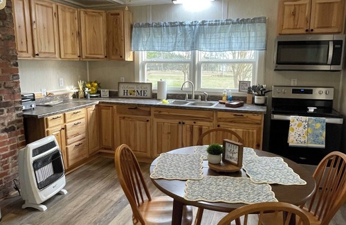 The master bedroom features a king size bed, full bathroom, a cooling window unit, and a gas heater. There are two other bedrooms, one with a queen bed and the second with two twin beds, both equipped with gas heaters for your comfort and the queen room with a cooling window unit. These bedrooms share a full bathroom right off the main living space. All of the bedrooms have televisions. The living room and all the bedrooms are accessible from the main foyer/hallway in the center of the house. As you exit the living room you enter the spacious dining room with fully equipped kitchen to the rear, both with cooling window units.
