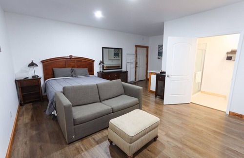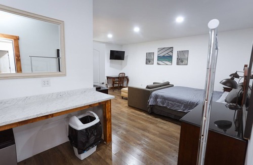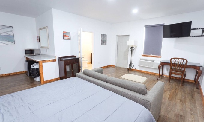 Indulge in luxury and comfort in our generously sized room featuring a lavish king-sized bed, spanning 400 square feet. Enjoy the convenience of modern amenities such as a microwave, mini-fridge, and TV, ensuring your stay is both comfortable and convenient. With secure keypad entry and a personal HVAC unit, relax knowing every detail is designed for your peace of mind and relaxation throughout your stay.
