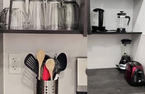 The space is equipped with ensuite washer/dryer, fridge, stove, microwave, dishwasher, blender, coffee maker + press, pots/pans, cooking utensils
