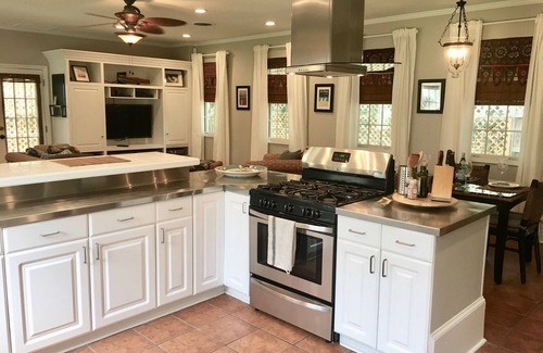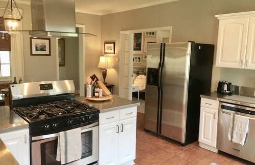 Guests will find a fully equipped kitchen with stainless steel appliances and countertops, a coffee and tea bar, a wide range of essential cookware, utensils, dishwasher, a toaster, blender, and microwave... everything you need to prepare meals at home. The dining area easily accommodates up to six guests. Nearby, the counter-level bar offers two sleek stools, making it a cozy spot for morning coffee or casual meals. We’ve designed every corner of the Chapel to fuse comfort with character. Step outside onto the screened porch—a tranquil spot for morning coffee or winding down in the evening, cooled by gentle breezes and shaded from the sun. The porch connects seamlessly to both bedrooms, making it an ideal retreat for conversation or quiet reading.