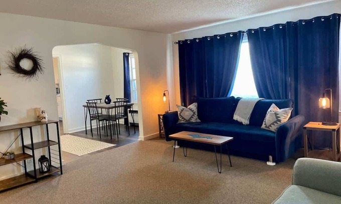 Experience the charm of downtown Ironwood at Village on Aurora! This condominium is perfectly situated steps from Ironwood's City Square and the historic Ironwood Theater. Enjoy easy access to Lake Superior, waterfalls, and beaches, all just a short drive away. With trails for hiking, biking, and snowmobiling right outside your door, and electric car chargers nearby, it's an ideal base for outdoor adventures. The Blue Room offers cozy Upper Peninsula decor and custom furniture, with two bedrooms, a well-equipped kitchen and free parking. Perfect for families, with options for children and infants, and all the comforts of home, including a washer and dryer.