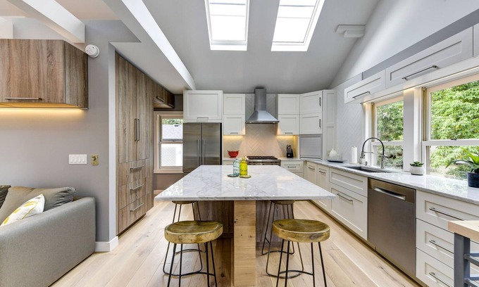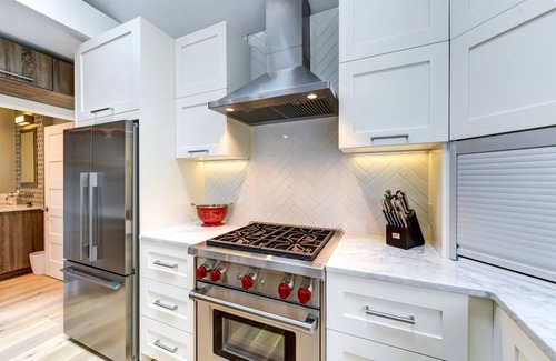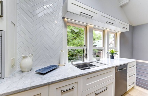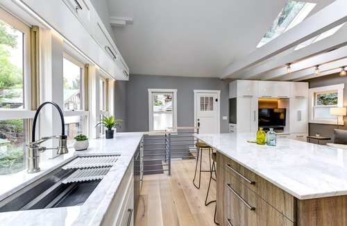 Fully equipped kitchen features Carrara marble counters, under-cabinet lighting, crackle herring-bone patterned backsplash tile, Wolf gas range/oven, powerful Zephyr range hood, Fisher Paykel refrigerator, Bosch dishwasher, Kohler Prolific Sink (with drying rack, soaking & strainer accessories), custom cabinetry, beautiful chandelier & two skylights. Multipure water filter at sink.