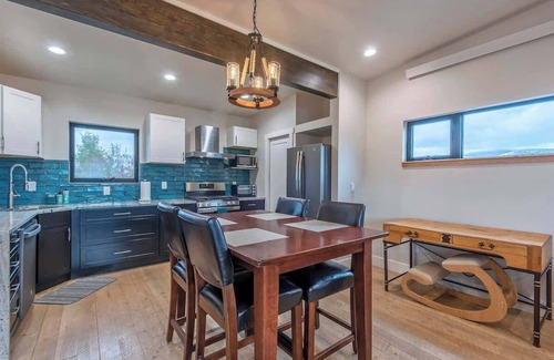 The living space boasts an open floor plan that takes advantage of the large windows and the surrounding scenery. Every window offers breathtaking views of the town and the surrounding mountain ranges. The well-equipped kitchen has everything you need to prepare a feast, or simply enjoy a cozy cup of coffee in the morning.