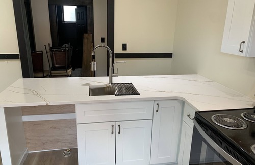 You can't get any closer to Downtown Danville. This recently renovated beautiful 2BR / 1 bath home (with brand new kitchen and furnishings) is the perfect place to stay if you are visiting your Centre student, attending a Centre sporting event, stopping on the Bourbon Trail at local Wilderness Trace Distillery, checking out historic Danville or Civil War battlefields, or touring the horse farms in nearby Lexington. Have a stress free and fun weekend in town by not having to deal with driving and parking. Just walk just 1 block and you will be at Dry Stack coffee cafe, Copper & Oak restaurant, Burkes Bakery, The Hub cafe, La Cosa Nostra restaurant, Bricks & Brews, Bluegrass Pizza, and Constitution Square (the birthplace of the State of Kentucky). Centre College is just 6 blocks away. The house has 10 foot high ceilings that add to the spacious vibe. This is the perfect home for Mom to cook her Centre student a home cooked meal while Dad watches the football game on the 58" TV in the living room. The chef will be delighted to prep meals in the fully stocked kitchen with White Silestone quartz countertops. Host small get togethers for your Centre student and their friends, or invite over some other Centre sports families that are in town for games. Load up your furry friend and head out of town stress free, not having to deal with boarding your pet.. (please disclose that you are bringing a pet at time of booking, $20/pet per day fee is charged). Treat yourself to a super fun and relaxing weekend in Danville and stay at the premier downtown Danville vacation rental home.