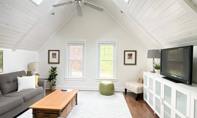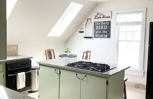 Lake Street Retreat is the UPPER unit in an original 1880's two family 'cottage' home. We own the entire property and are lucky enough to spend the majority of our summer in the lower unit. The upstairs received a modern makeover in the Spring of 2021. It is filled with a combination of local antiques and art to give it a "welcome home" feel. It also features skylights in the kitchen, bath and living area which create a unique tree house effect. The kitchen is fully stocked with everything from wine glasses to an ice cream scooper.