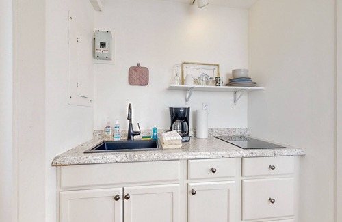Kitchenette w/fridge, two-burner stove, microwave. No dishwasher.