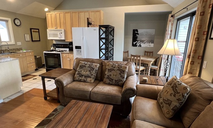 Features include cozy leather furniture, HD TV, videos, free WiFi, and large deck with gas grill. It has an open floor plan and is bright with vaulted ceilings. Beautiful backyard in the summertime. Friendly owners on site with local advice!