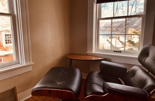 The front door of the house is off of the front porch at the top of the stairs (see pictures). Hang out on the front porch and enjoy the beautiful mountain views and the activity in town below you, or enter through the front door into a charming living room. Off of the living room you will find a fully-equipped eat-in kitchen with dining table for 6 plus 3 countertop stools and a half bath. Head up the stairs to the second floor where you will find 2 bright bedrooms (both with awesome views!), a full bath, and a super-cozy TV room. Exit out to the back patio from the TV room, and wander up the hill in the back yard to find an absolutely spectacular view of the Harpers Ferry Gap!