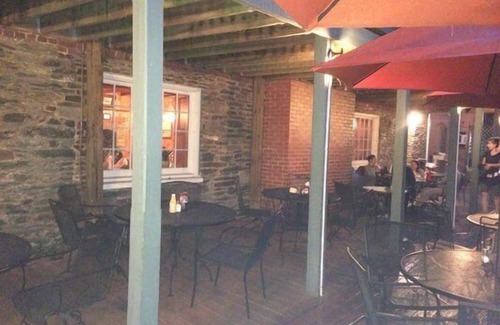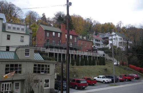 Mountainside Lodge is located in the heart of historic downtown Harper's Ferry, and in the middle of Harper's Ferry National Historical Park. This one-of-a-kind vacation rental is located in a 2-1/2 story brick federal-period building built in the 1830's. The house shares the building with a family-style restaurant (The Rabbit Hole) and a very popular gift and jewelry shop, The Vintage Lady. The house was originally 2 townhouses, and the center walls were removed in the 1970s to create a large open space on the 1st floor. While the house's exterior painting scheme reflects this original configuration and looks like 2 separate units, the vacation rental spans both spaces (see photo). The building was used during the civil war by both Confederate and Union Armies, primarily as an infirmary/hospital, and is a stop on the Harpers Ferry Ghost Tour.