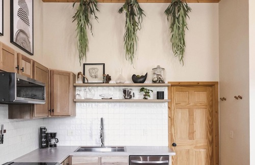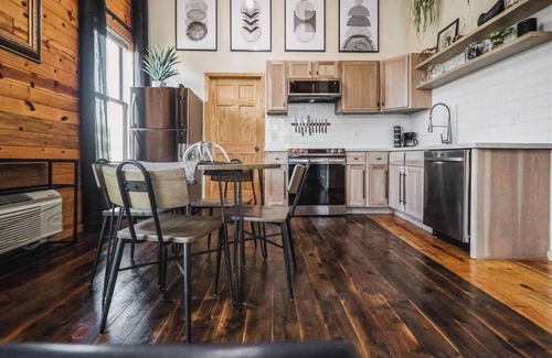 Take in the beautiful knotty pine and 12ft ceilings in this thoughtfully designed suite by House of Altered Artifice. You can cozy up to the fireplace on the cozy Restoration Hardware sofa and enjoy a book from our small library.