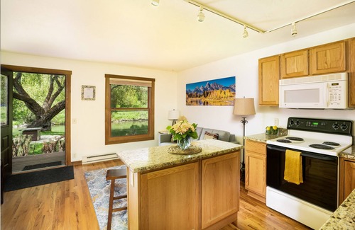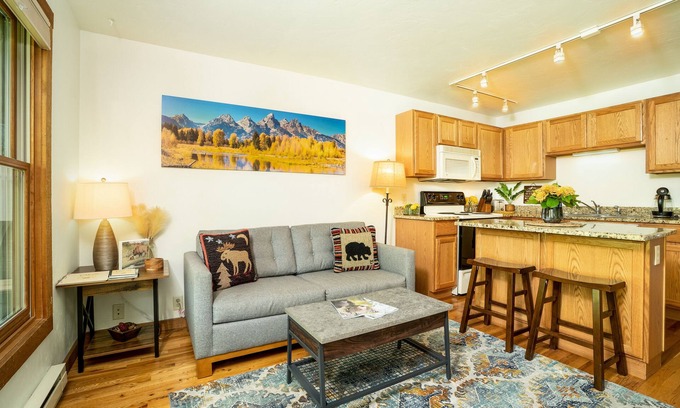This 1 bedroom, 1 bathroom condo on Flat Creek provides a quiet and private experience with incredible access to Town Square. A short walk to restaurants, spa, shopping and fun! A beautiful setting with a shared lawn overlooking Flat Creek . Lots ducks, geese & swan. Ground floor unit with hardwood floors and granite countertops. Perfect very central location for all excursions. License #7243-20