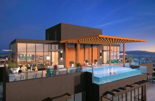 It features desired lifestyle amenities including a rooftop sky pool and lounge, social BBQ and lounge areas, gardens, fitness facility, and co-working spaces.