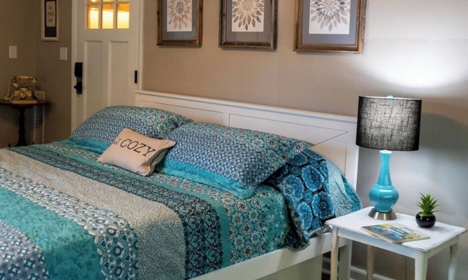 This early 1900's immaculate charming property offers everything you need for a phenomenal stay with cleanliness as a top priority. As you enter this charming studio apartment, you will conveniently already be in it’s large bedroom /living room combination, with hardwood floors, a king size bed, a pull out queen sleeper sofa, 50 inch T.V, and a dining drop leaf table. You’ll have plenty of space to relax and unwind. Stay connected with WiFi, and enjoy convenient amenities such as AC, heating, a full efficiency kitchen with a farmhouse sink, granite counter tops, microwave, oven/stove, refrigerator and coffee bar. Enjoy all the essentials of a spacious luxury bathroom equipped with a tiled shower and a beautiful sliding glass door.