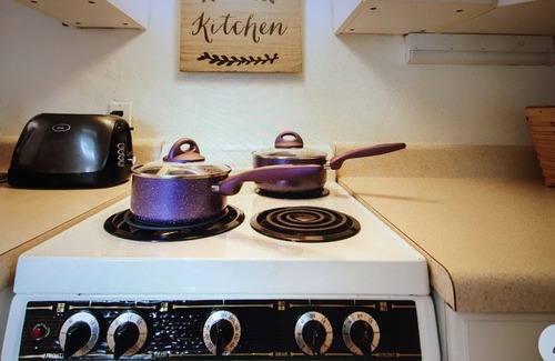 Your light and airy space offers a shabby chic slip covered sofa, smart tv( Netflix ROKU) and antenna tv, 600 Mbps WIFI Xfinity internet, bistro dinette set, full kitchen w oven stove refrigerator toaster and coffeemaker for K cups or ground coffee, welcome basket, walk thru closet, bath equipped with sunflower showerhead, storage, lavender liquid soap lavender body wash lavender shampoo, blow dryer, garment steamer plush lavender towels and many lavender themed amenities.