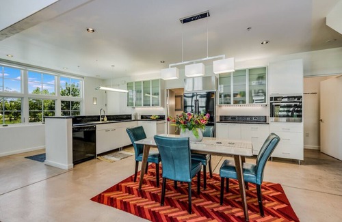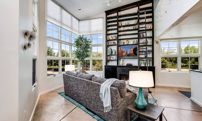 This light-filled 2 story condo is steps from the Santa Fe farmers market, the Violet Crown theater, Whole Foods and the best restaurants and attractions in Santa Fe. Loft style open floor plan with contemporary furnishings. Large two story space with 20 ft high windows overlooking the Santa Fe Rail Yard Park. Newly renovated and furnished. Air conditioning. Private off street parking. Like nothing else in Santa Fe.