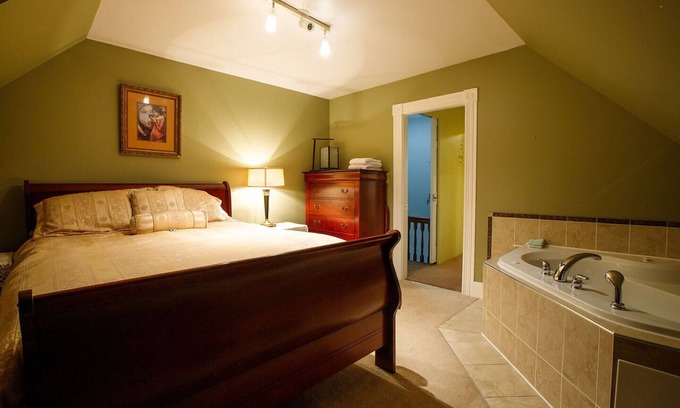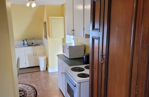 One of a kind suite on third floor of Victorian style building. Spacious. eat-in full kitchen, two personJacuzzi in bedroom & amazing, comfy posturepedic Queen bed, plus full bathroom with claw foot tub. Located near Astor theatre, Curling Club, Walk to Lighthouse park, Trestle Trail, bakery, restaurants, and more.