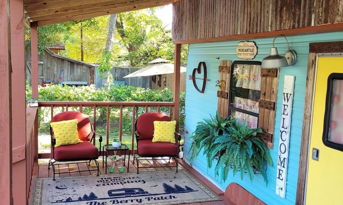 This glamped up 1963 Wilderness Camper, now a tiny home, nestled in the heart of the Piney Wood.