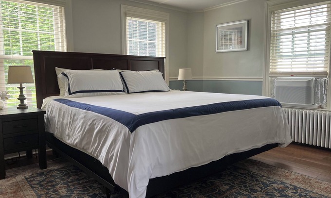 The large bedroom has a king-sized bed, armoire and flat screen SMART TV. It offers beautiful views of the historic Training Green.