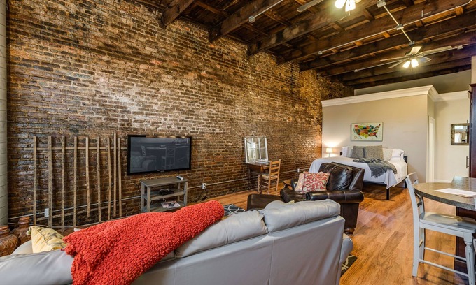 This modern 600 sq ft studio apartment on the historic West Side in Cookeville is the perfect place to stay for a weekend getaway, college visits, local downtown festivities and sporting events! Come enjoy this convenient location where you can walk to local restaurants, coffee shops, boutiques, Crossfit Mayhem, Tennessee Tech, and most importantly, Cookeville's famous Ralph's donuts! It has a full size bed, sofa, roomy chair, full kitchen, bathroom with shower/tub and outdoor porch! You will enjoy the historic feel of the loft with the exposed brick walls and tall ceilings! We look forward to hosting you soon!