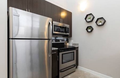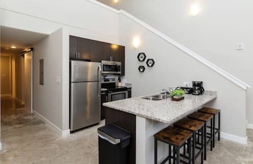 Guests will enter into the main lobby and take a short elevated ride up to the cozy condo. Inside the unit features a full kitchen, dining area and breakfast bar, dedicated workspace, living room with smart TV, 2 bedrooms both with smart TV's while also having access to shared spaces such as a community area with games, 24/7 fitness facility and rooftop lounge with dog park/relief area.