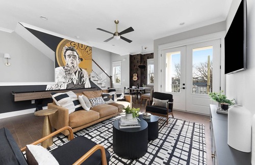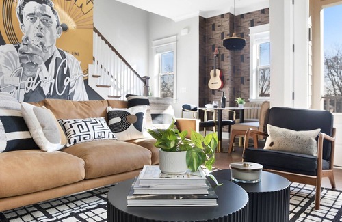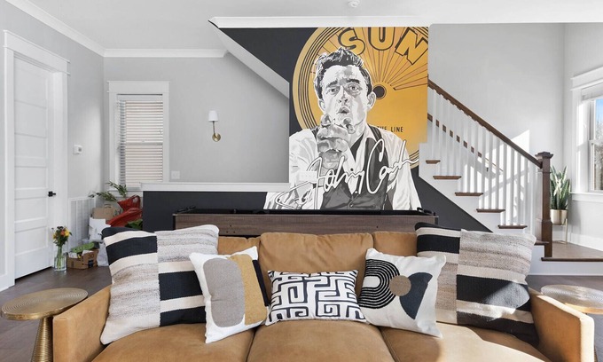 Welcome to Downtown Nash | Outlaw Theme | Large Groups, an extraordinary 4-bedroom, 4-bath hideaway designed for large gatherings and celebrations. This uniquely themed accommodation is perfect for your wedding party or bridal retreat, comfortably sleeping up to 14 guests. The captivating Johnny Cash mural and Nashville-inspired decor create a warm, inviting atmosphere that sets the stage for unforgettable memories as you prepare for your big day.