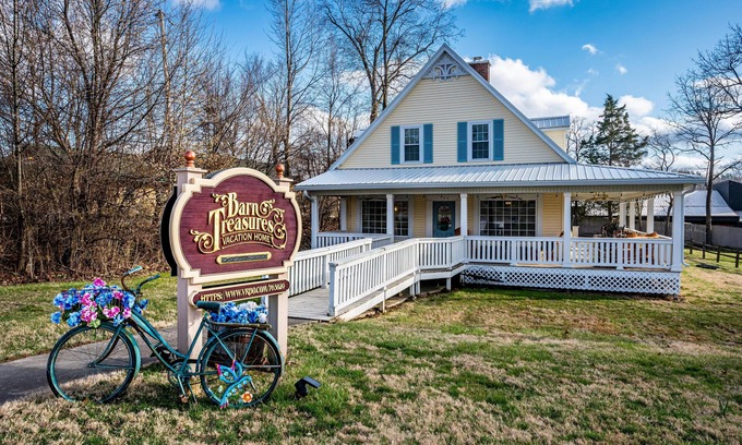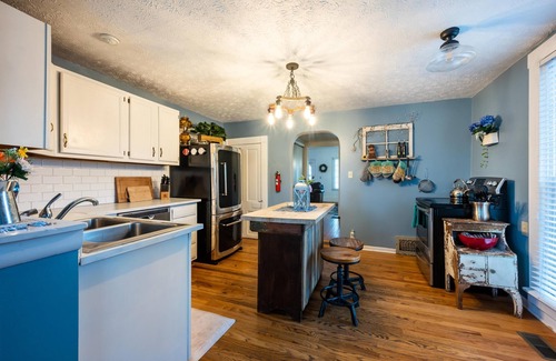 This beautifully redecorated home features five inviting bedrooms, each equipped with new mattresses to ensure a restful stay. The large living room and dining area seamlessly accommodate gatherings, whether it's a pre-wedding brunch or family reunion. Experience the nostalgia of hardwood floors and an original staircase alongside modern conveniences like smart TVs in the living areas and bedrooms. The well-equipped kitchen includes modern replicas of vintage appliances, adding charm and functionality to your wedding preparations. For additional convenience, there's even a main-level bedroom and bath for those who prefer to avoid stairs.
