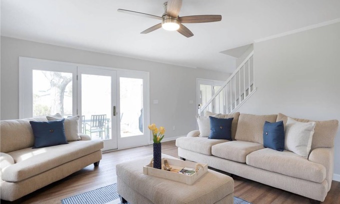 This charming 3BR, 2BA duplex vacation home within walking distance from Downtown Oxford is designed with your comfort in mind. The character-filled interior is complemented by a first-floor bedroom and bathroom, relaxed living space and plenty of natural light.