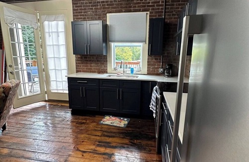 Industrial loft in downtown Pittsboro - walk to everything or just relax on the spacious deck and enjoy music from the City Tap or Havoc! You will be in the heart of everything with easy access to the shops, bakeries, wine store, restaurants, breweries and other Pittsboro attractions. Loft is furnished comfortably with a king Murphy bed, pull out sofa bed, and wet shower with heated floors, heated towel rack and a stocked kitchen. Come enjoy industrial chic in comfort!